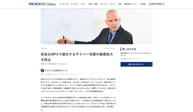 ランサムウェアなどのサイバー攻撃が今後も長く続くと予測されている中、企業の情報資産を守るためには、パスワードを補うMFA(多要素認証)を継続的に利用しなければいけないと提言している株式会社インターナショナルシステムリサーチのメンデス・ラウル代表取締役社長に話を伺いました。今後求められる認証強化の対策となるMFAはどのようなものか、詳しく説明していただきました。