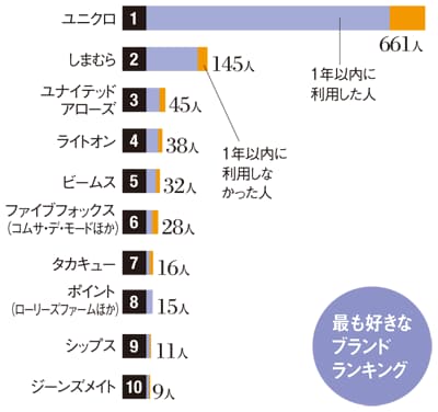 衣料品専門店では国内ブランドが見事にワン・ツー・フィニッシュを飾った。とはいえ、グラフを見ておわかりのようにユニクロ(ファーストリテイリング)が2位のしまむらを500人以上引き離す、ぶっちぎりのトップになっている。