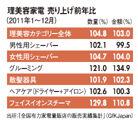 ヘアケアやフェイスケアなどを目的とする理美容家電市場が緩やかに拡大している。女性向けでは“うるおい”が、一方男性用は“身だしなみ”がキーワードになっており、それぞれのニーズに沿った新機能が新たな需要を掘り起こした。2011年は、数量で対前年比4.8%、金額で同じく3.0%の伸びとなっている。