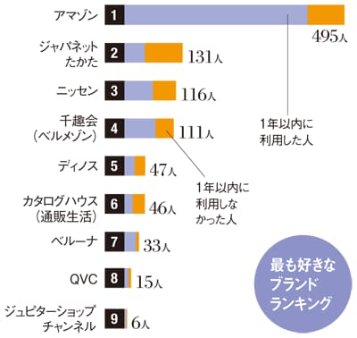なにしろ「地球上で最も豊富な品揃え」を標榜する会社である。他社に圧倒的な差をつけて通販部門の首位に立ったアマゾンは、とりわけ「品揃え」の面で飛びぬけた評価を獲得した。