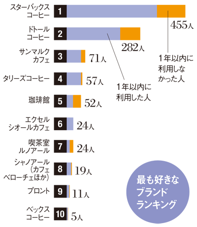 スターバックスコーヒー(以下スタバ)が2位以下を圧倒的に引き離し、最も好きなコーヒーチェーン1位を獲得した。興味深いのは、近隣にスタバがない場合、徒歩や車、電車などの交通手段を使ってでもスタバに行きたい、すなわち「わざわざ行きたい」という人がほかに比べて圧倒的に多いことだ。これはブランド力の構築に成功したからにほかならない。なぜ、スタバだけがそれを実現できたのだろうか?