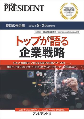 不確実性の高い時代、いかなる戦略で、どのような方向を目指すのか。経営トップからのメッセージを発信するのが「トップが語る企業戦略」です。顧客や投資家層はもちろん、自社内、さらには貴社への就職・転職を考える人など、社内外のステークホルダーに生の声、真の思いを伝える場としてご活用いただけます。毎年実施している人気の企画です。