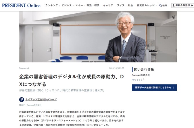 日本を代表する経済学者、伊藤元重・東京大学名誉教授へのインタビュー記事。経済・ビジネスの環境変化を踏まえ、企業は成長の原動力となるDXにどう取り組むべきかを伺いました。また、Sansanが提供するクラウド名刺管理サービスを利用することでどのような効果が生まれたのか、具体的に語っていただき、その魅力について訴求しています。