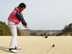 飛距離が出ないアマチュアの多くは、ダウンスウィングでヘッドが外側の高い位置から急激に下りてきます。アウトサイドインといわれる軌道で、ヘッドを上からボールにぶつける打ち方。これではヘッドがスクエアに戻らないし、カット打ちになってスライスやヒッカケが多発しかねません。