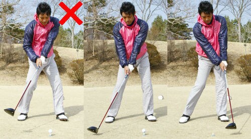 クラブを目標より右に向けて地面に置き、フォロースルーでその方向にヘッドを出すようにする。