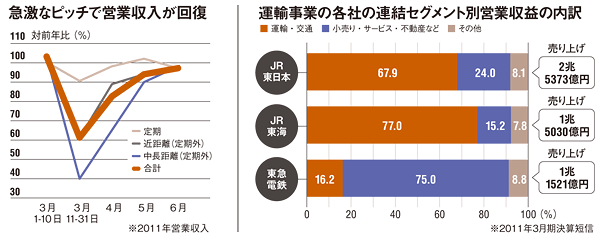 東日本大震災が発生した10年度決算(11年3月期)をみると、連結売上高は2兆5373億円(前期比1.4%減)。このうちの67.9%に当たる1兆7219億円は鉄道、モノレール、高速バスなど本業の「運輸業」が占めている。これに続くのが駅構内の物販などの「駅スペース活用事業」の3858億円(構成比15.2%)、次いで駅ビルの「アトレ」「ルミネ」など「ショッピング・オフィス事業」の2232億円(同8.8%)、ホテル業や広告業など「その他」の2062億円(同8.1%)の順となっている。08年度のリーマン・ショックと10年度の東日本大震災の影響をまともに受けて、運輸業の売上高は08年3月期の1兆8577億円をピークに下落傾向が続いた。