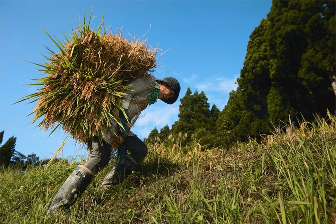 【岩本】繰り上がりで優秀賞となった「棚田の苦労」は、黄金色に実った大きな稲穂の束を背負いながら、急な棚田の斜面を力強く上る女性の姿が収められています。当社は、環境への取り組みを進める上で「地域との共生」を重視しており、地域の財産や伝統を守ろうとするこの作品もまた当社の理念を巧みに表している作品だと思いました。佳作の「まだまだヤレル!」は、想像もつかない年月を生き抜いてきた大樹の圧倒的な存在感から、大きなエネルギーをもらえる作品です。また、自然の力と対峙しようとする人間のたくましさを写し出した「雪にもまけず」は、陰で人々の日々の暮らしを支える様を表しており、生命保険のあるべき姿に通じるものがあると感じました。このほか惜しくも受賞を逃した作品を含め、応募作品は思わず声が出るほど素晴らしい作品ばかり。作品を通じて当社のテーマや環境への理念を深くご理解いただいていることを実感し、感激しております。