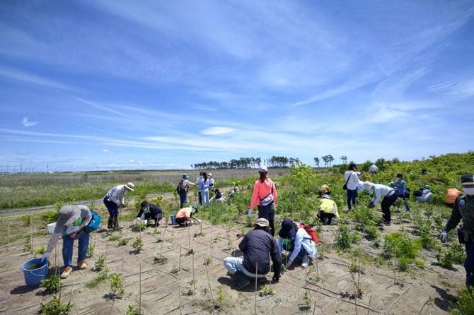 また、全国の支部における地域活動への協力も当社の特徴の一つです。例えば北海道道東支社ではラムサール条約登録湿地の「春国岱」で外来植物の除去、山形支社では「鮭川の森」の保全活動など、各地域で生物多様性・環境保全の活動が盛んです。当社では、約7万人に及ぶ全役員・職員の一人一人が、1年に一度以上は何らかのボランティア活動に従事することを掲げており、近年は100%の達成を継続しています。