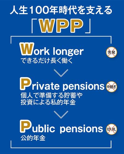 WPPとは年金の専門家の間で使われている言葉で、老後生活の資金を賄うための考え方だ。Wは「Work longer(できるだけ長く働く)」、次のPは「Private pensions(個人で準備する貯蓄や投資による私的年金)」、最後のPは「Public pensions(公的年金)」の頭文字だ。