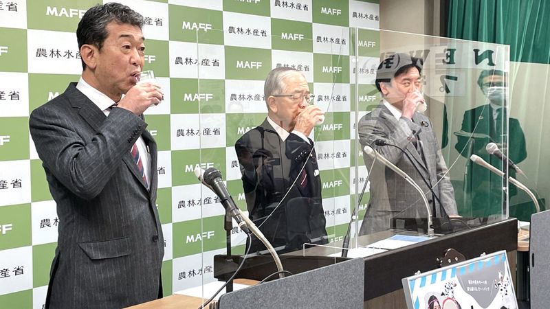 記者会見で「飲むヨーグルト」を飲んで乳製品の消費をアピールする金子原二郎農林水産相(中央)と、牛乳を飲む中村裕之(手前)、武部新両副大臣=2021年12月17日、東京・霞が関の同省