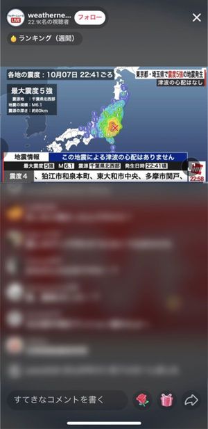 【今井】以前から地震などが発生した際、それとは無関係にバズっている動画のコメント欄で地震の情報交換を行うユーザーが見られました。そこに潜在的なニーズを感じたのが配信を始めたきっかけです。おかげさまで今は、最新の気象情報や災害情報を24時間365日伝えられる体制ができました。一人当たりの平均視聴時間も着実に伸び、情報交換の場としての認知も高まっています。