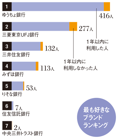 最も好きな銀行ブランドではゆうちょ銀行が第2位の三菱東京UFJ銀行を100人以上引き離してトップに躍り出た。今回の調査では地方における各銀行への認知度の差が結果に表れているように思われる。