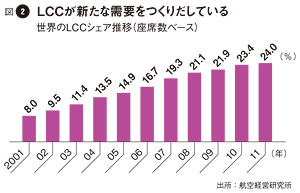 3社揃って2012年から就航を開始するのは偶然の一致ではなかろう。世界の航空市場はいま、LCCの奔流に呑み込まれつつある。LCCは1971年に就航したアメリカのサウスウエスト航空が元祖とされるが、追随するエアラインが登場しては消え、本格的な普及期に入ったのは00年代に入ってから。アイルランドのライアンエアーやイギリスのイージージェット、エアアジアやジェットスターなどの躍進で、01年にはわずか8%だったLCCのシェア(座席数ベース)は、11年には24%に達した。
