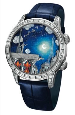 “ポエトリー オブ タイム”という独自の視点から叙情的な時計づくりを展開するヴァン クリーフ&アーペル。この新作は、2時位置のリュウズを操作すると男性が時を示す位置まで前進。同時に向かいから雲が近づき、双方が出会うと夜空に流れ星が現れて分を表示する。これらのオートマタが作動している間に、5分単位までの時刻を音で知らせる5ミニッツリピーターも作動。発想や機構に加え、伝統技法を駆使した装飾はまさに芸術作品の域。