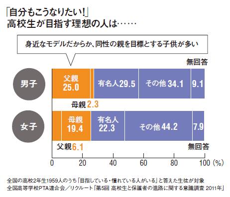 #目標・計画 2012/04/21 15:00 目指す人物に父親を挙げる男子高校生25% 母親を挙げる女子高生19% プレジデント ファミリー 目標や憧れの人がいると答えた高校生は約29%。思春期真っただ中にもかかわらず、親という回答も少なくない。コメントには、家族を大切にしたり仕事や家事に頑張る親の姿への評価が目立つ。思った以上に素直なまなざしを前に、親は襟を正す必要がありそうだ。 ランキング 1位 そりゃ人も企業も逃げ出すわけだ…年金財政ボロボロでも、人権国家をやめられないドイツという反面教師 ランキングをもっと見る ライフ #目標・計画