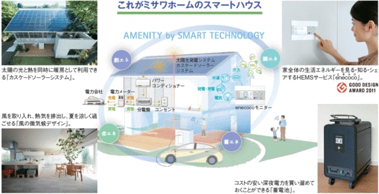 今後、国の主導によって技術や機器の規格化・標準化が進み、スマートコミュニティの構築が加速していくことが予想されている。ミサワホームのスマートハウスは、プラグインハイブリッド車(PHV)や電気自動車(EV)との間で双方向にエネルギーをやりとりするための先行配線や、設備・家電の操作や制御のための通信ケーブル設置も提案する。