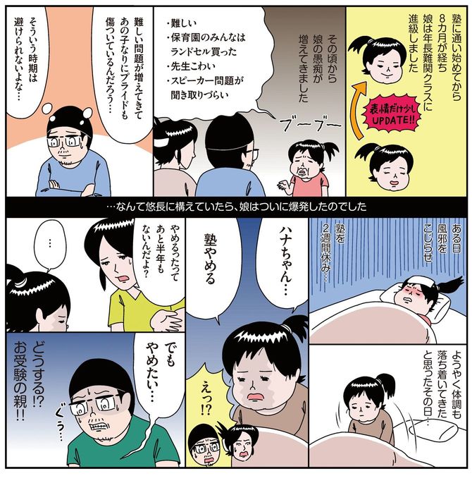 塾の年長クラスになると、問題も難しくなり、周りにできる子が増え、娘からぽつぽつと弱音や愚痴が出てくるようになりました。それでも次第にクラスにも慣れ成績はまずまず。ゴールデンウイーク特訓も休まず通い落ち着いていたのですが、体調を崩し寝込んだことで一変、モチベーションが急激に下がりました。