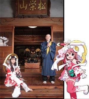(右)松栄山了法寺・中里勝孝住職(45歳)。立正大学仏教学部卒。1989年より住職を務める。(左)イラストを描いたとろ美さん。寺での催しでは、毎回「とろ弁天」(画像)のコスチュームで登場している。