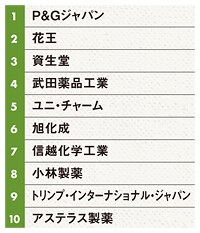 【業種別ランキング:化学・薬品・素材】P&G、花王、資生堂の3強時代!/上位3社で約半数の票を集めた。首位P&Gに次いで票を集めたのが花王だ。その理由として、約半数が「働く人が、人材として成長する機会が与えられ、そのことを喜びと感じている」と回答した。3位の資生堂の最多理由は、「働く人が、仕事に達成感を感じて、活き活きと働いている」(約半数が選択)だった。