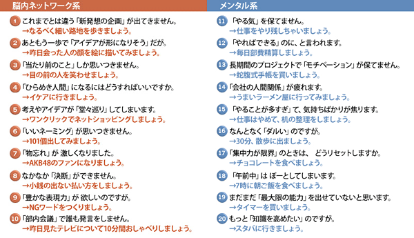 ダルい、眠い、そわそわ……どうも頭の働きが鈍っているようだ、と感じるときがある。動かない頭でうんうん唸っても非効率。そこで、よくある職場の困った“あるある”シチュエーションを、ひらめきなどの脳内ネットワーク系と、やる気などのメンタル系にわけて、20の設問にまとめた。最新脳科学と心理学による実践的な処方箋を伝授しよう。