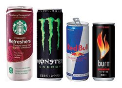 左からリフレッシャーズ(スターバックス・国内未発売)、モンスターエナジー(アサヒ飲料)、レッドブル(レッドブル・ジャパン)、バーン(日本コカ・コーラ)。