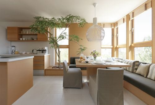 コーナー開口により、明るく開放的なダイニング。備え付けのベンチを90度に配置することで、「向かい合う」位置から「隣にいる」位置に。より心理的な距離感が縮まる。