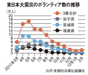 1年余りが経過してなお、東日本大震災の被災地にはボランティアが入り続けている。彼らの受け皿となる全国社会福祉協議会・災害ボランティアセンターの集計によると、今年3月18日までに岩手、宮城と福島の3県で延べ95万2700人が活動したという。これ以外にもNPOや企業から参加した人もおり、全体では200万人を超えることは間違いない。