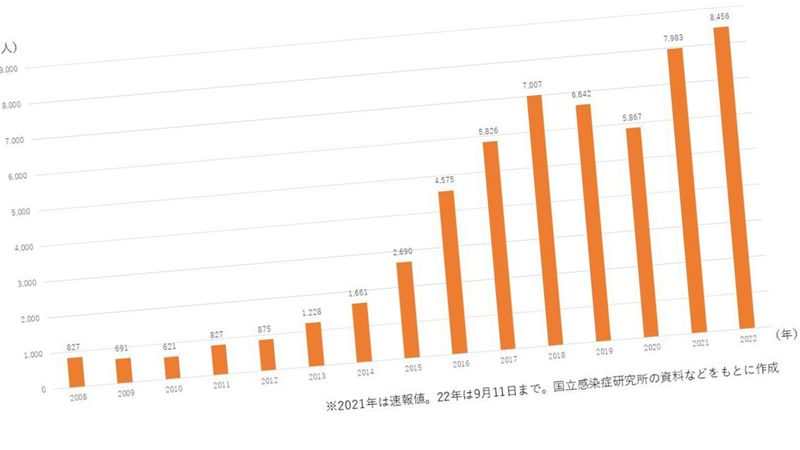 梅毒の感染者の、2022年の報告数は8456人(9月11日現在)に達した。現在の調査方法となった1999年以降で最多だった21年の7875人(速報値)を上回り、過去最多を更新したことになる。重村医師は、急増の理由を次のように話す。