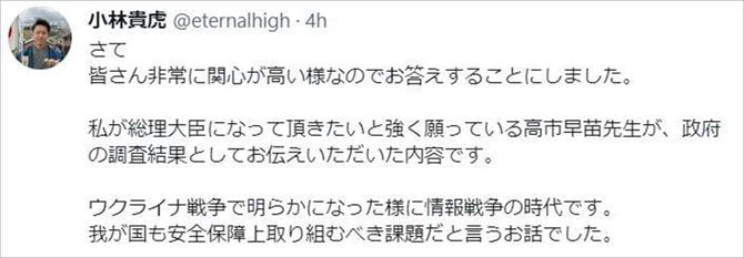 そうした動きを受け、高市氏は4日、自身のツイッターでこう反応した。