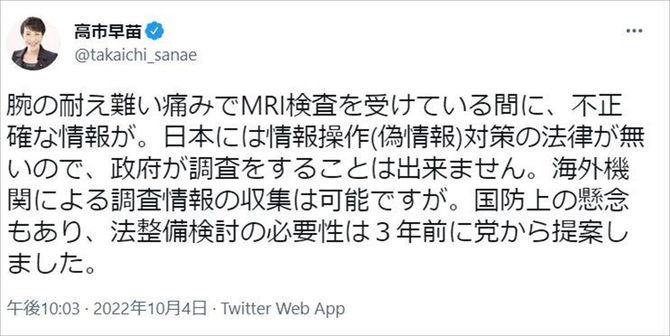 <腕の耐え難い痛みでMRI検査を受けている間に、不正確な情報が。日本には情報操作(偽情報)対策の法律が無いので、政府が調査をすることは出来ません。海外機関による調査情報の収集は可能ですが。国防上の懸念もあり、法整備検討の必要性は3年前に党から提案しました。>