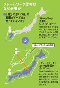 そのようなときにぜひ活用したいのがフレームワークだ。フレームワーク思考とは、枠組みを利用して体系的に物事を考える手法である。思いつきが自分の狭い視野に頼った属人的な発想法であるなら、フレームワークは客観的・俯瞰的な白地図を用意して、それに沿って考えを整理したり深める思考法といえる。