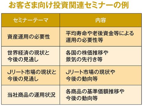 しんきんアセットマネジメント投信自身は直接お客さまに商品を販売していませんが、信用金庫の職員向けに投資信託の販売業務に関する研修をしたり、お客さま向け投資関連セミナーに講師を派遣するなど、資産運用のプロとして多面的なサポートを行っています。