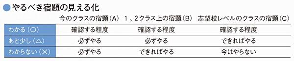 こうして目に見える形にして、宿題の優先順位を親子で共有していくのです。○・△・×の割り振りはわが子の感覚に任せればよいのですが、最初は△ばっかりになったり、×が多すぎたりするかもしれません。