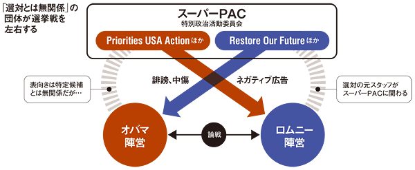 しかも10年、選挙資金を無制限で集金できる政治活動団体(PAC)が誕生した。これは選対とは別団体である。以前からPACという政治団体はあったが、最高裁が有権者の献金の自由を保証する判決を出して「スーパーPAC」という呼び名がついた。すでに300近い団体ができた。