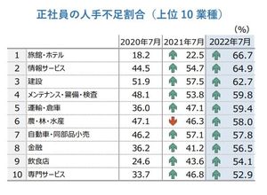 興味深いデータもある。帝国データバンクが今年7月に行った「人手不足に対する企業の動向調査」で、正社員が足りないと答えた企業は47.7%と半数に迫った。パート・アルバイトなど非正社員についても28.5%が「足りていない」と答えた。社員不足が最も顕著なのは「旅館・ホテル」で66.7%と全体の3分の2に上る。パート・アルバイトなど非正社員が「足りない」と最も多く答えた業種は飲食業で、全体の73%だった。