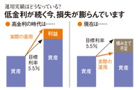 高金利の時代は国に納める保険料の一部を借りて資産を大きくして運用したほうが得だった。ところが低金利で市況も悪かった過去10年間の運用実績は平均年1.2%と低水準。一方で、約8割の基金の目標利回りはいまだ5.5%と非常に高いため積み立て不足となり、多くの基金に巨額損失が発生している。