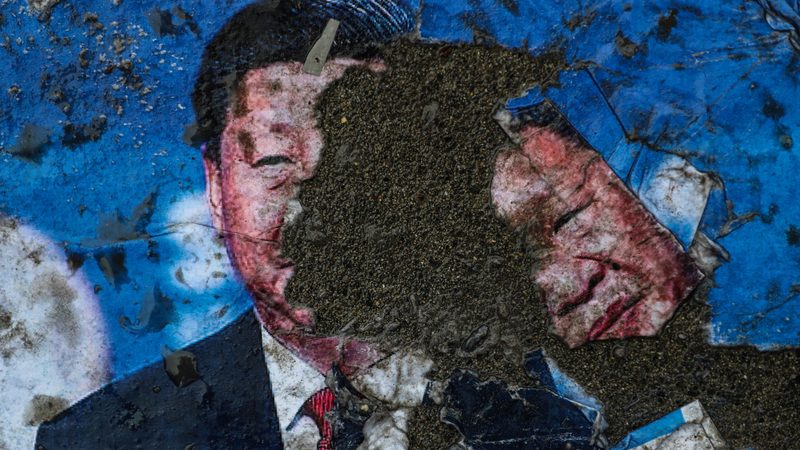 トルコ・イスタンブールで行われたウイグル人に対する中国の人権侵害をめぐる抗議デモで、バラバラに引き裂かれた習近平国家主席の写真=2022年12月4日