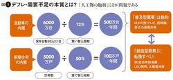 日本を襲っているデフレ現象・需要不足の根幹にあるのは、「有限の地球」という事実、さらに「人工物の飽和」という現象だ。たとえば自動車であるが、現在、国内で保有している自動車の台数は約6000万台で、人口当たりで換算すると2人に1台となる。日本では自動車の寿命は約12年だから、年間需要は500万台しかない(図1)。