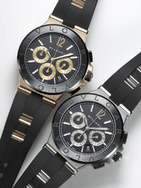「ディアゴノ・セラミック」。おなじみのダブルロゴが刻まれたベゼルはセラミック製。セラミックは焼成前後で約30%も縮むうえ、焼成後の加工も困難な素材。自社グループでの一貫生産体制に基づいた高水準の技術力を象徴する。