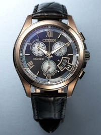 「シチズン エクシード」。カウンターと文字盤外周に白蝶貝を用いた艶やかな電波時計。世界26都市の時刻とUTCが分かるダイレクトフライト機能搭載。