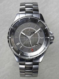 「J12 GMT」。周囲の色みによって色調を変える独自素材を特徴とするモデルにGMTが登場。細みのベゼルや大小の数字を配したダイヤルなど、モダンで個性的なセンスはいかにもシャネル。