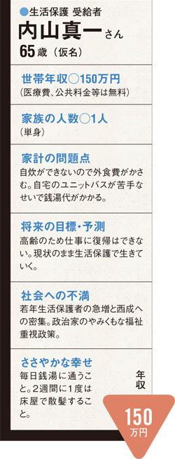 そう語るのは、大阪市の西成区、通称「あいりん地区」に住む内山真一さん(仮名)。自身も5年前から市の生活保護を受け、この街で暮らしている「受給者」だ。全国的に知られるドヤ街・西成。わずか500メートル四方のこの地域には2010年4月現在、6万9989世帯が居住しているが、その約3分の1にあたる2万4550世帯が生活保護の給付を受けている。近隣には安宿や大衆食堂、安酒場がひしめいており、一部では「受給者の天国」とまでいわれるエリアだ。