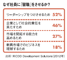 日本で留職が広がるには、ネックがある。それはコストだ。社員1人あたり数百万円かかるといわれている。海外では数年前から、米IBMや米スターバックスなど、資金力のある大手企業で「International Corporate Volunteering(ICV)」という留職プログラムの導入が、盛んになっている。すでにグローバル企業が動き始めていることは間違いない。
