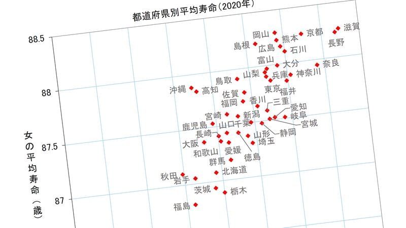 2020年の都道府県生命表の平均寿命(0歳時の平均余命)について、X軸に男性の値、Y軸に女性の値をとった散布図を作成するとともに、その中に長短3県ずつの寿命データを表にして掲げた(図表1)。