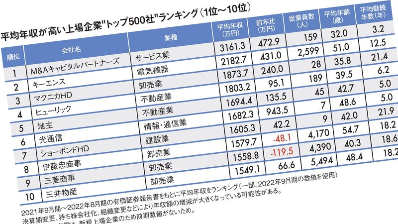 プレジデントオンラインは、全上場企業の「社員平均年収ランキング(2022年版)」を作成した。基にしたデータは直近の年次決算期における有価証券報告書(2021年9月期~2022年8月期、一部企業については、2021年9月期の数値を使用)。データ抽出では、経済・金融データサービスの株式会社アイ・エヌ情報センターの協力を得た。