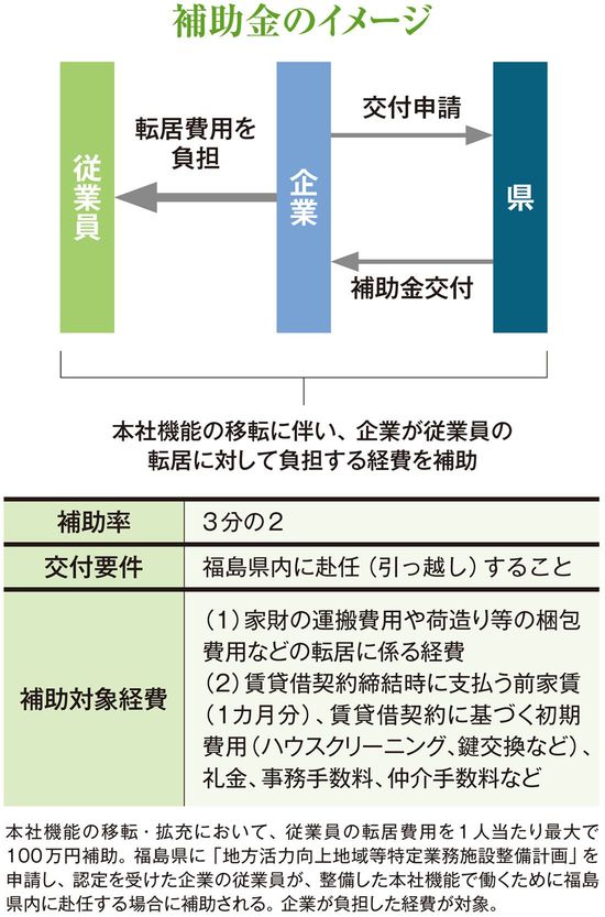 これに加えて、「福島県本社機能移転促進事業費補助金」を独自に設けている。整備した「本社機能」で働くために、県外から福島県へ従業員が赴任する際に発生する「企業が負担する引っ越しの経費」に対して補助金が交付される。補助率は3分の2、従業員1人当たり最大で100万円が補助される。1社当たりの年間の補助限度額は500万円で人数制限などは設定されていない。