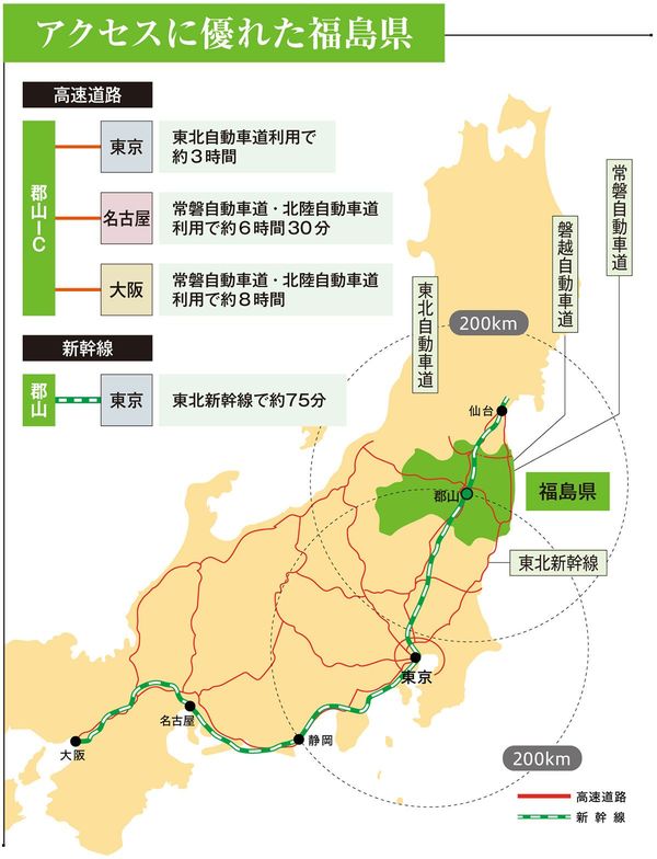まず、優位性を発揮するのが「良好なアクセス」だ。福島県から首都圏までは200キロ圏内。東北新幹線を使えば、郡山~東京間は75分ほど。県内には、東北自動車道、常磐自動車道、磐越自動車道の3本の高速道路が走っており、2021年4月には、東日本大震災と原子力発電所事故からの復興を象徴するインフラの一つである東北中央自動車道(相馬~福島間)が全線開通。東北自動車道と常磐自動車道に接続されたことで輸送時間が短縮され、物流効率化による企業の販路拡大や事業開拓が期待されている。また、福島空港や小名浜港、相馬港からは国内外とのアクセスも可能となっており、陸路・空路・海路のいずれの交通基盤も充実している。