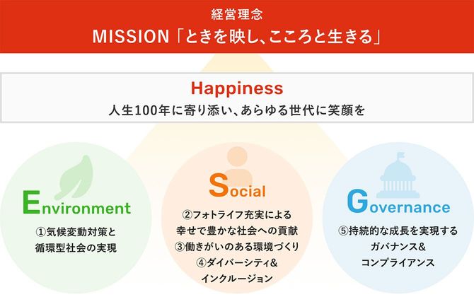 【佐藤】「ときを映し、こころと生きる」という当社ミッションにあるように、一人一人の大切な瞬間、思い出、記憶といった「とき」を写真や映像として残すためのお手伝いを通じて、全ての人が心の充足を得られる社会の実現を目指しています。そのためには、当社の従業員、そして全てのステークホルダーが幸せであることが前提です。