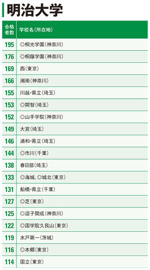 明治大の上位20校を見ると、男子校が川越・県立、浦和・県立、春日部、海城、城北、芝、逗子開成、本郷の8校が入っているが女子校はゼロだ。女子校は104人合格の鴎友学園女子まで出てこない。女子の占有率はアップしているが、ランキングの上位進出までには至っていない。
