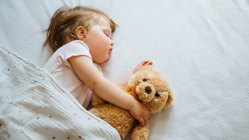 クマのぬいぐるみとお昼寝している赤ちゃん